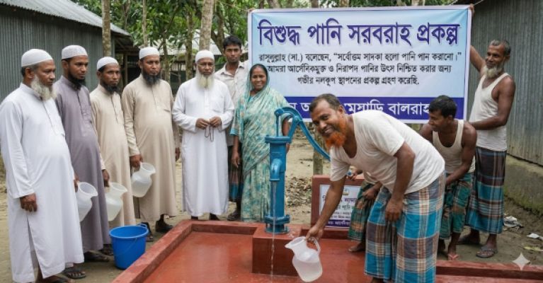 রাসূলুল্লাহ (সা.) বলেছেন, '��র্বোত্তম সাদকা হলো পানি পান করানো।' আমরা আর্সেনিকমুক্ত ও নিরাপদ পানির উৎস নিশ্চিত করার জন্য গভীর নলকূপ স্থাপনের প্রকল্প গ্রহণ করেছি।